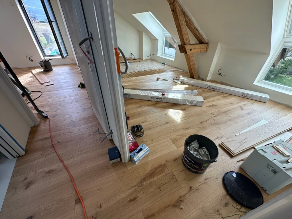 Installation soignée de parquet en chêne, durable et élégante.